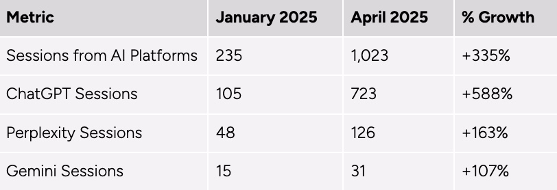 The growth of LLM platforms paired with OneSafe’s timely and targeted content helped LLM-referred traffic grow more than 4X from January to April—a signal that OneSafe is quickly becoming a trusted, cited resource for finance teams.