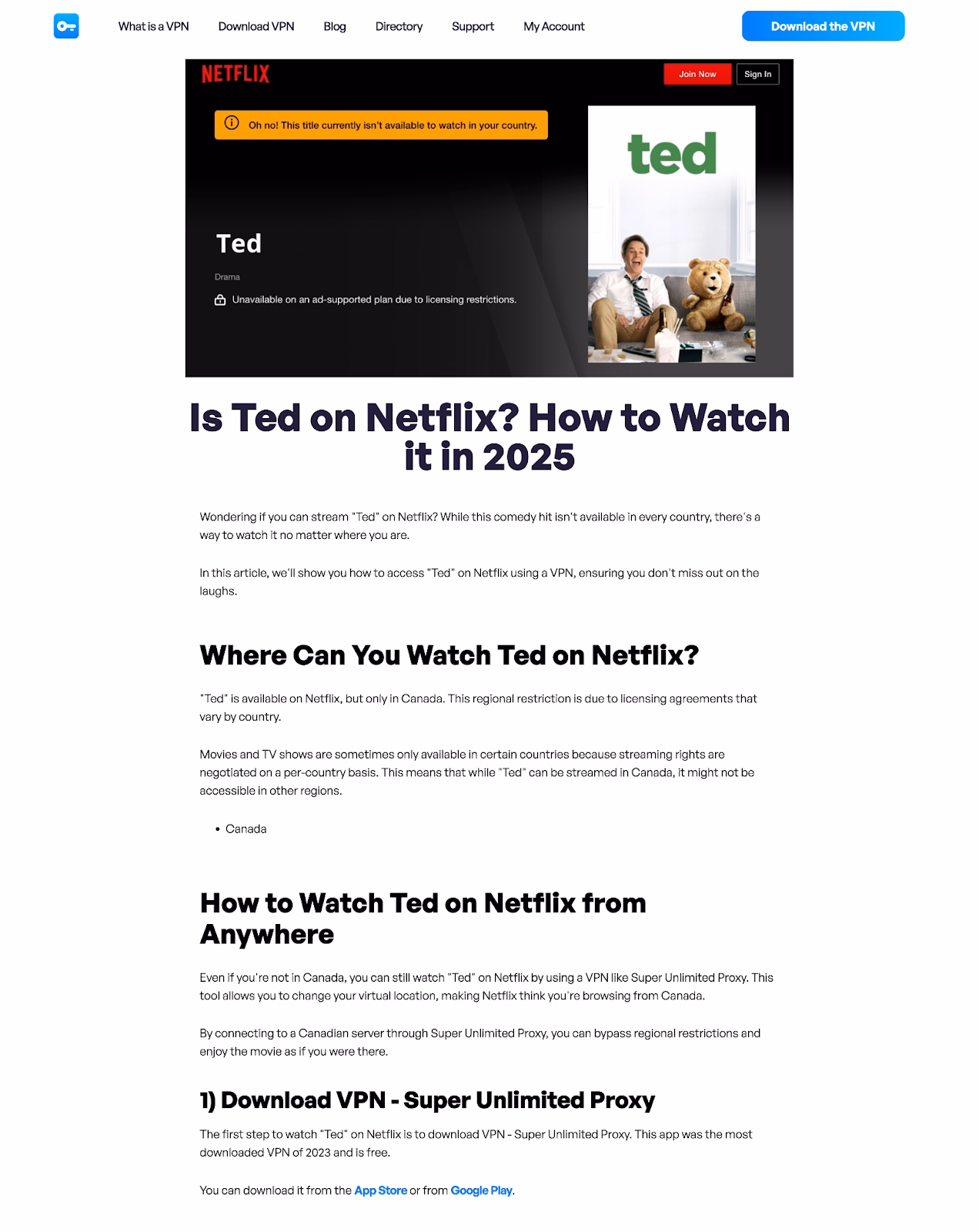 This template strategically connects usersâ intent to watch specific shows/movies to VPN usage by explaining how to access global content. Even better, it offers VPN Superâs product as a solution