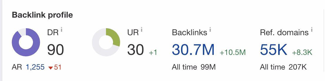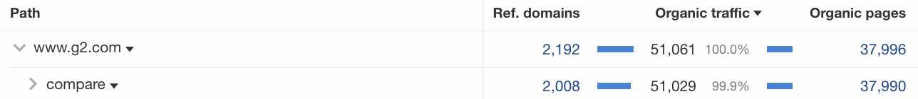 According to Ahrefs, G2 has more than 30 million backlinks. G2’s product, category, “best of,” comparison, and listicle pages account for close to 45,600 (about 80%) of G2’s referring domains (per Ahrefs).