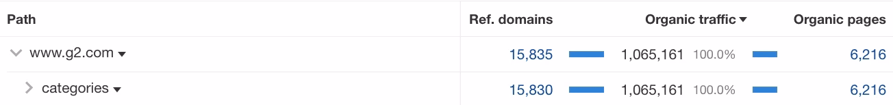 G2's site has more than 6,100 category and sub-category pages, which account for close to 1.1 million organic monthly visits (per Ahrefs).