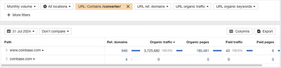 Coinbase uses two core pSEO pages to drive over 6 million monthly visits (per Ahrefs data). These two pSEO page types are designed to attract mid-to-lower funnel searchers looking for information about purchasing and exchanging cryptocurrencies (i.e., those with transactional intent).