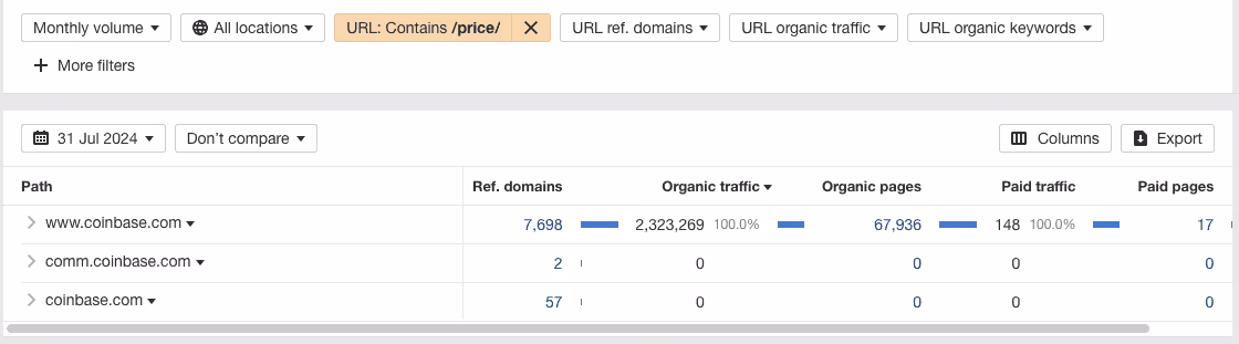 According to Ahrefs data, Coinbase.com receives more than 8.3 million visits every month and ranks for more than 800,000 keywords. However, what’s most interesting about Coinbase’s SEO strategy is its use of programmatic SEO (pSEO), which draws in more than 72% of its organic traffic.