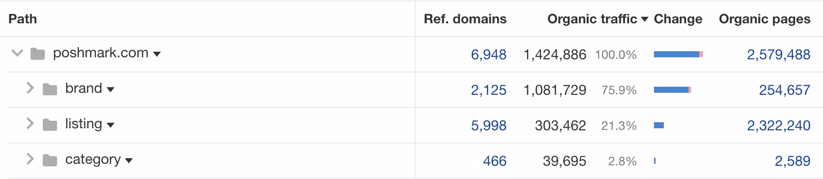 According to Ahrefs, the fashion and home goods resale platform Poshmark captures more than 2.7 million organic visitors per month. The vast majority of its 2.5+ million pages are product listings, but they’re organized categorically so that users can easily browse by gender, item type, and brand.