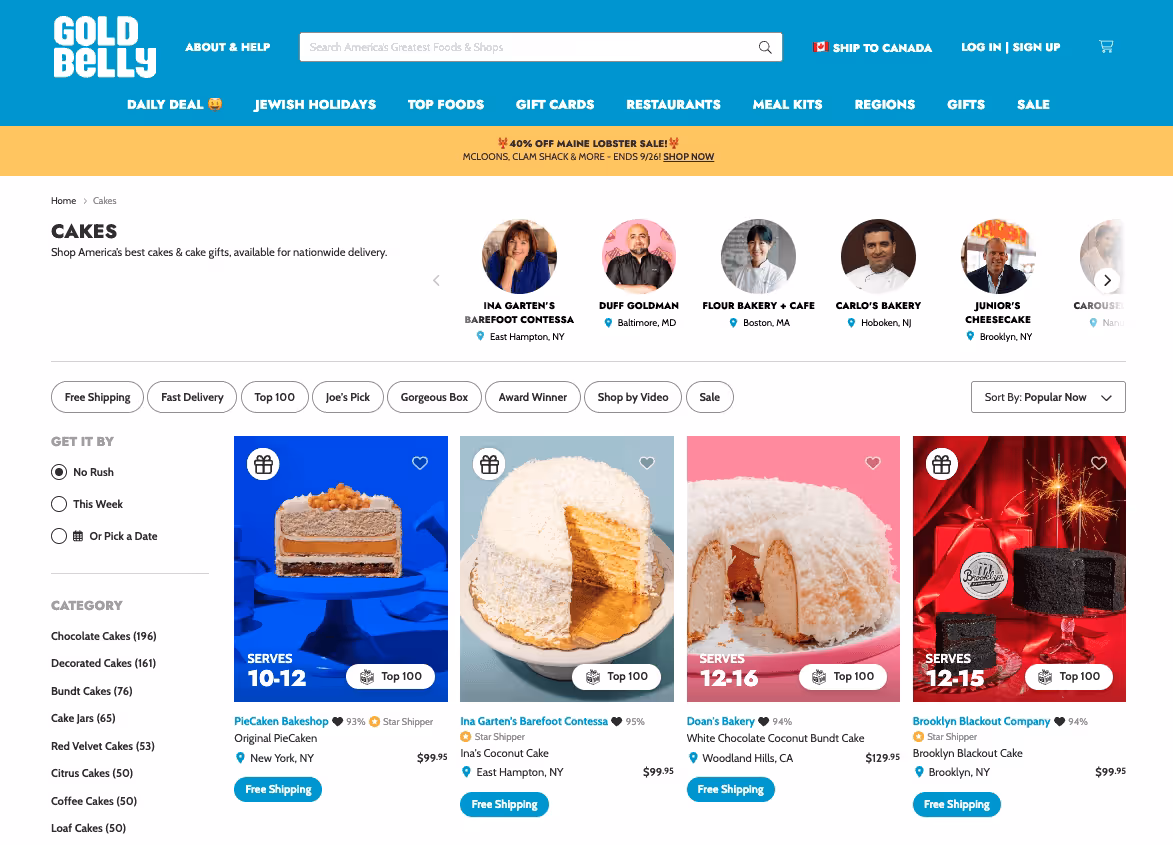 Goldbelly’s individual listings feed into these categories, helping the pages rank for niche search queries. For instance, Goldbelly’s cake category page (/foods/cake) ranks for more than 1,000 keywords, including long-tail terms like “luxury cakes delivered” and “sponge cake delivery.”