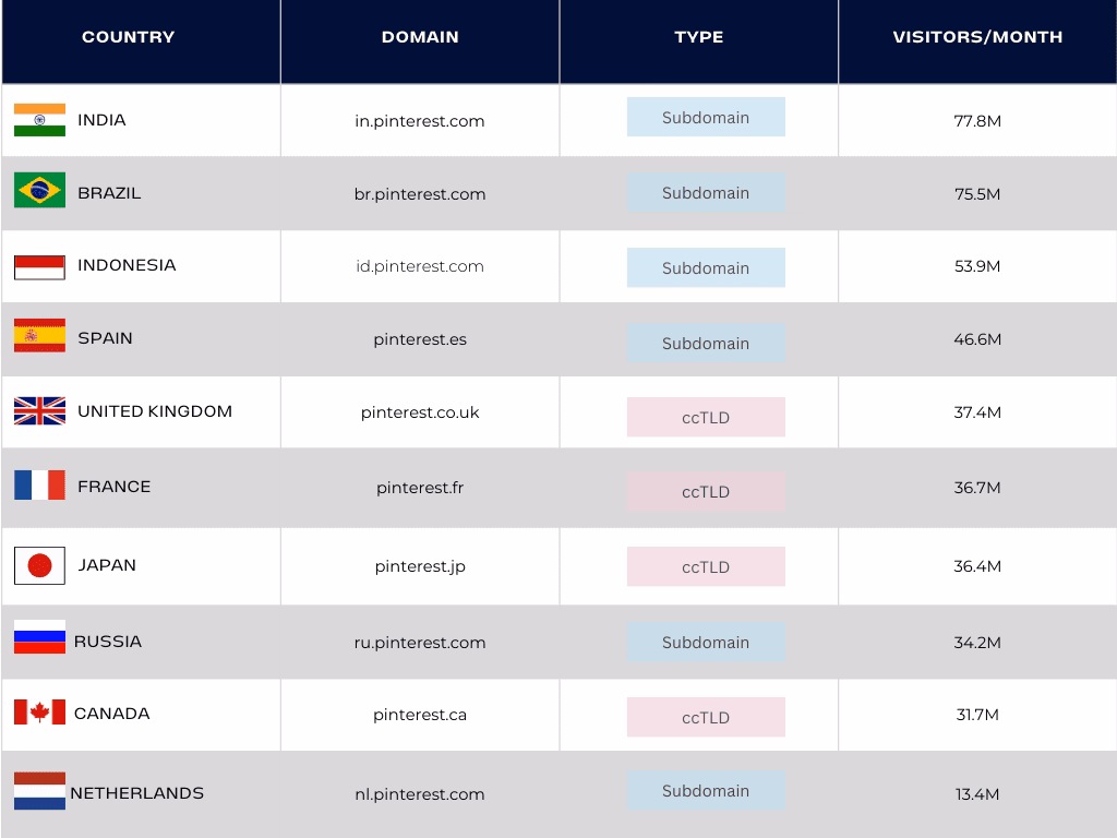 Below are the traffic statistics across Pinterest’s top geographies with specific tags labeling subdomains vs. ccTLDs.