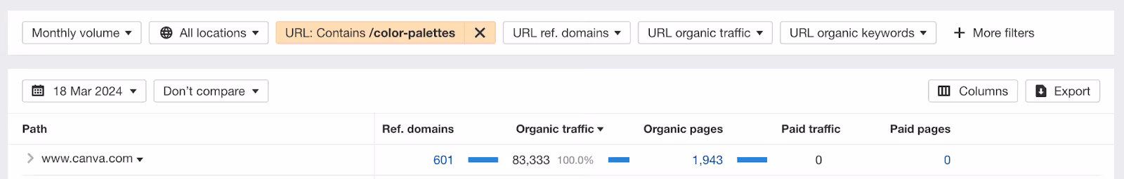 Each of the color-meaning pages links to a color palette library which includes dozens of related color palette options. The color palette pages follow a streamlined template, enabling Canva to scale the production of more than 1,900 color palette pages, resulting in about 83,000 monthly organic visits.