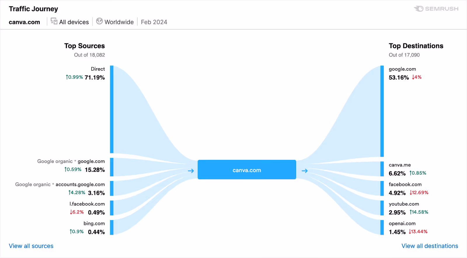 Canva’s focus on product-led growth is paying off. The product is considered a must-have tool among amateur designers who return again and again to Canva to solve their design-related needs. According to SEMrush, Canva’s direct traffic accounts for 71% of their overall traffic — a strong signal that users benefit from the platform.