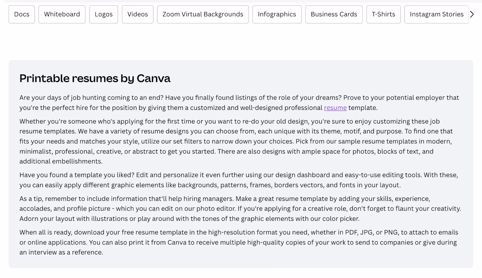 At the very bottom of the page is a long-form description of the template category. While it’s unknown how Canva produces this text, the SEO team likely creates search-optimized text for each category using AI.
