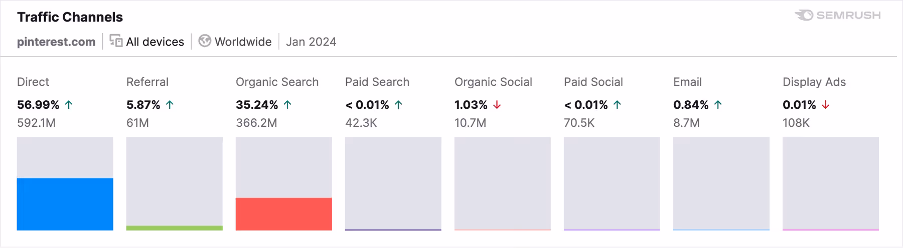 According to data from SEMrush, Pinterest relies on a two-pronged approach to drive the vast majority of its traffic: