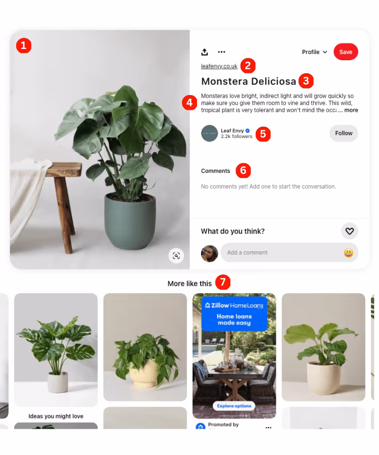 - Pin pages (“pins”): Pinterest describes these pages as “visual bookmarks” that users create to save content they love. All pins follow the same template that’s been optimized for search engines.