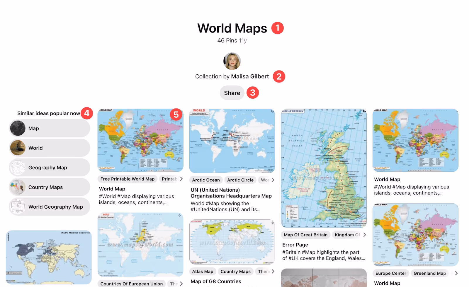 - Pins: Each pin page is displayed as a card on the board. The card includes the pin image, title, and description.