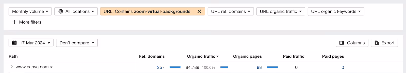 - Scalability: Once a template page format is established, it can be applied across various categories and subcategories. Companies can use search trend data to identify new template opportunities and quickly create corresponding pages. For example, in response to the shift to remote work during COVID-19 and the need for video conferencing, Canva created Zoom background templates, which now draw in about 85,000 monthly organic visits (per Ahrefs).