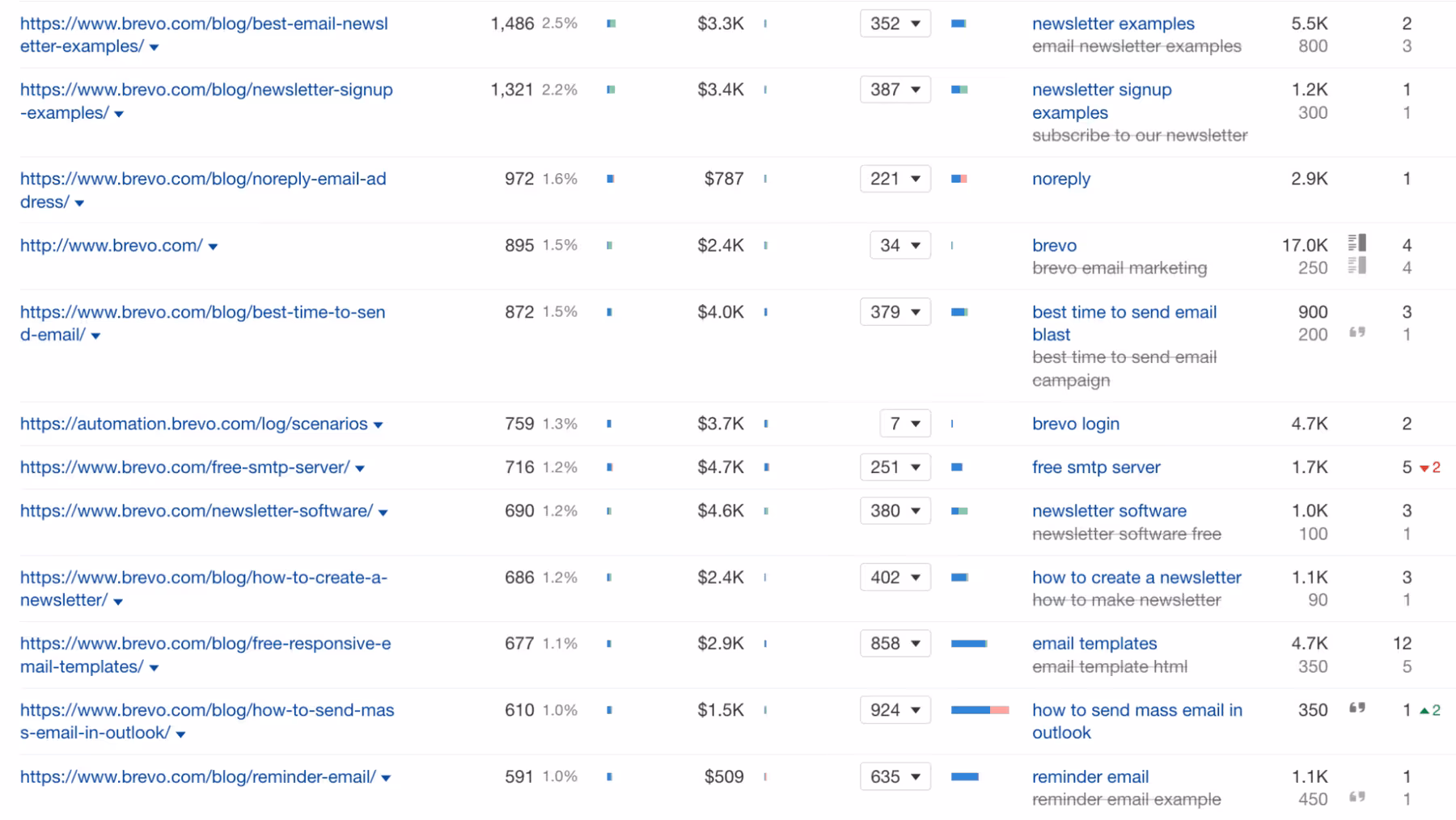 - Relevant template-related “head terms” captured by competitors (like the Brevo example above) and opportunities to implement a long-tail keyword strategy that expands on these terms.